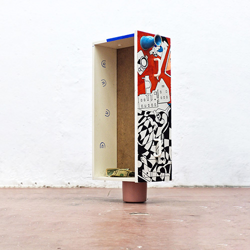 | SCHUBLADEN DENKEN ist der Titel eines Raumbilds (ca. 30 x 20 x 80 cm, 2025), mein Beitrag zur Gruppenausstellung „Kunst am Küchenmöbel“ |